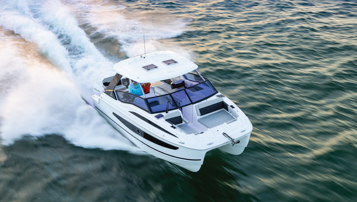 El catamarán a motor Aquila 32 Sport responde a la llamada del horizonte con una performance ágil y toda la inteligencia de una embarcación de día, en un formato perfectamente pensado.