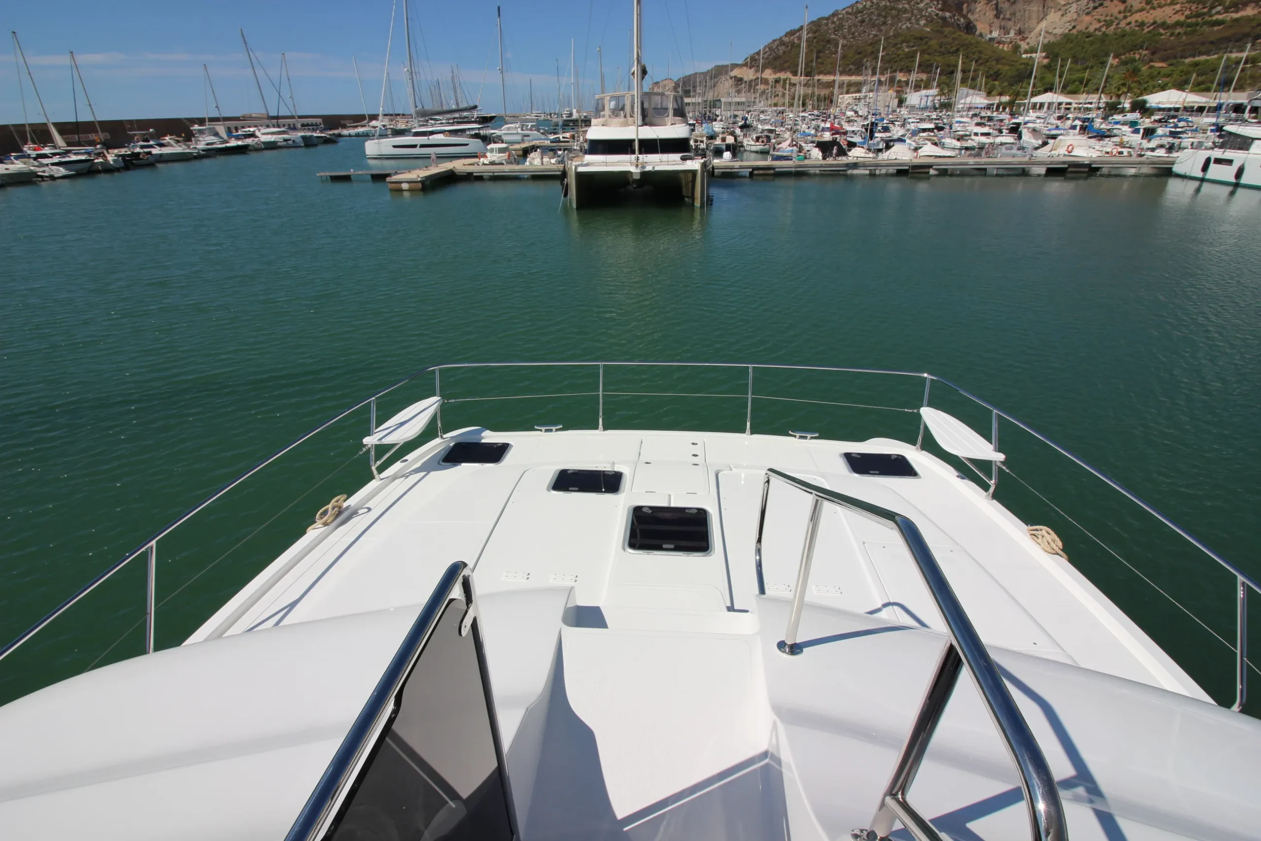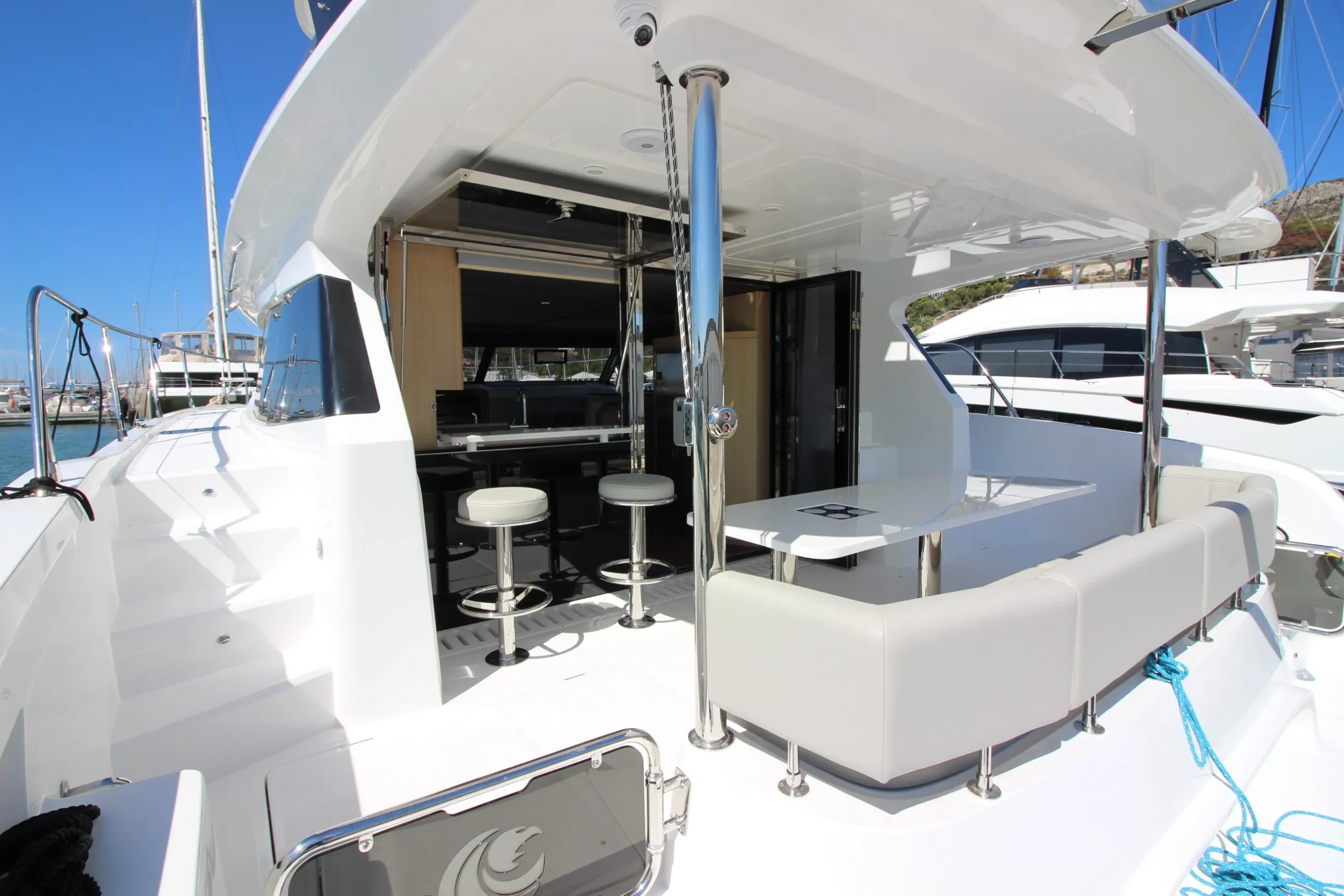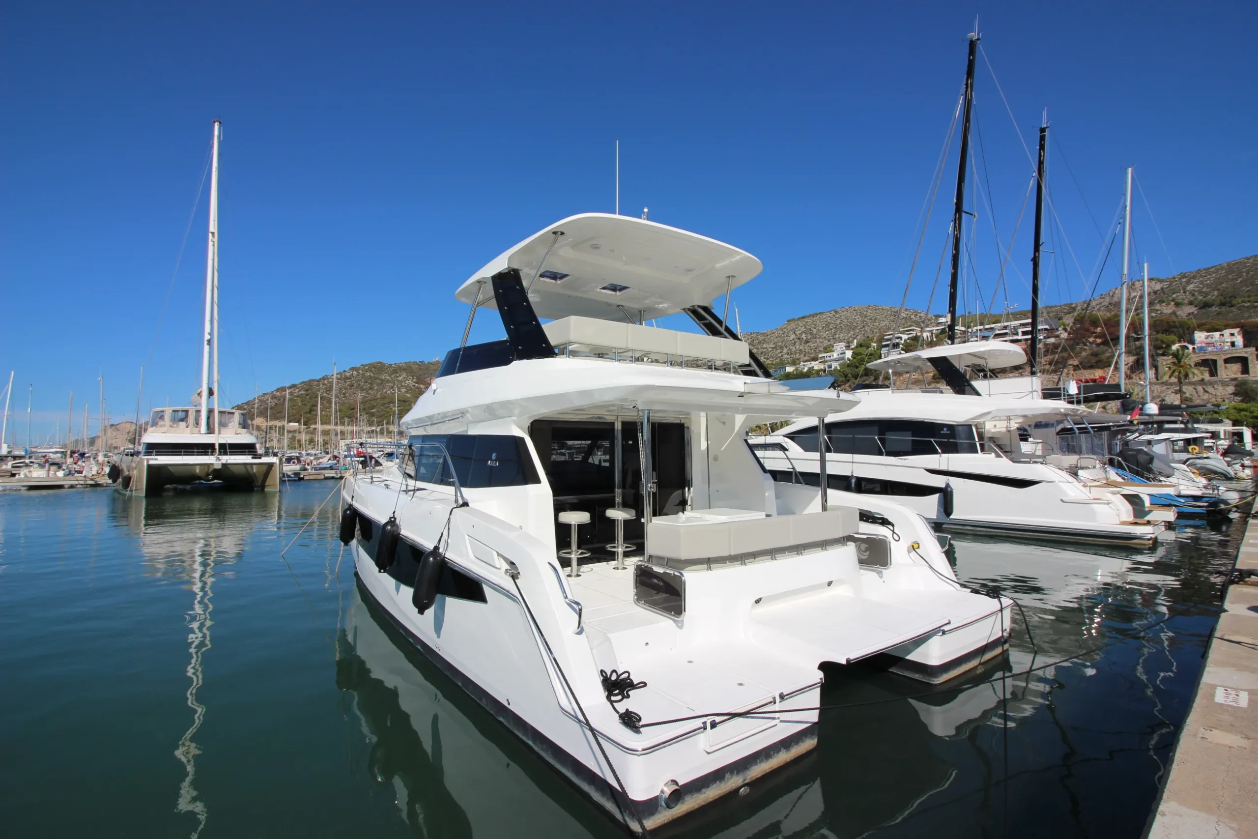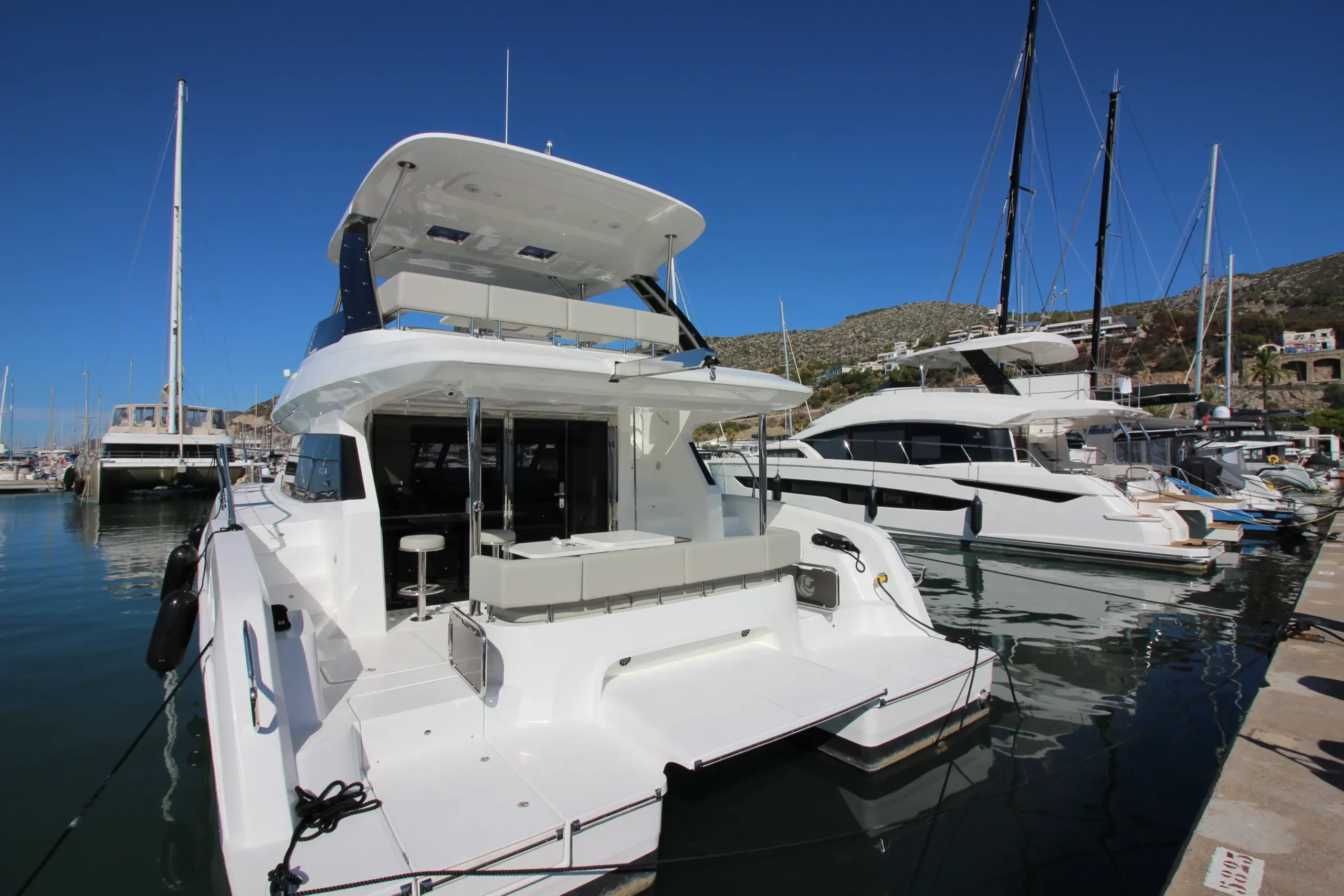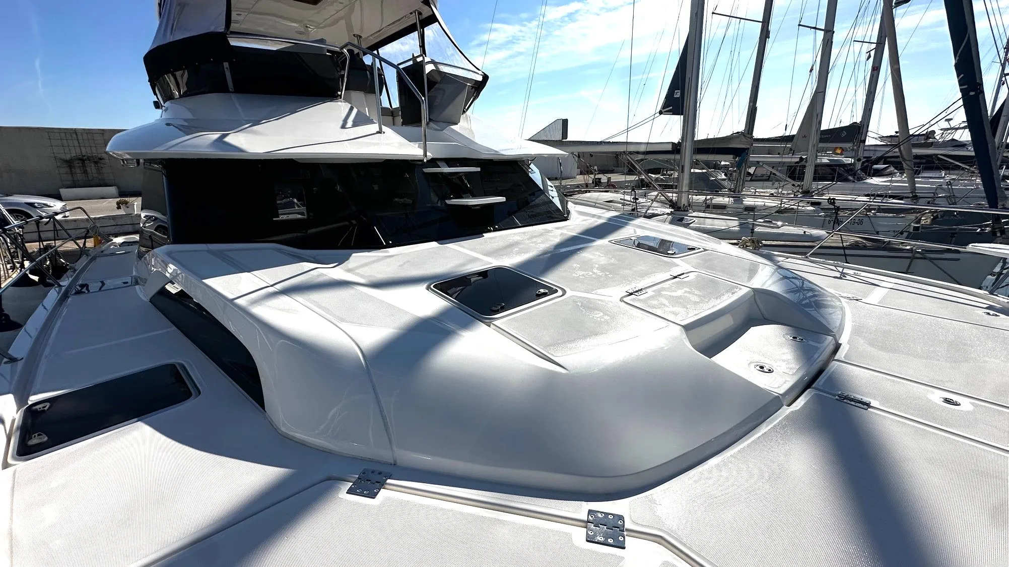 Aquila 46 de cinco cabinas, un baño, equipado con 2 motores intraborda Volvo Penta D6 de 480 HP, grúa eléctrica para dinghy con plataforma fija en popa, sistema de aire acondicionado de 50.000 BTU, completo pack de navegación Raymarine con piloto automático y radio VHF, además de foco con control remoto. Un catamarán robusto y listo para el charter, con flybridge, mesa y ducha en bañera, escalera de baño y cocina de inducción eléctrica. Entrega: Primavera 2026