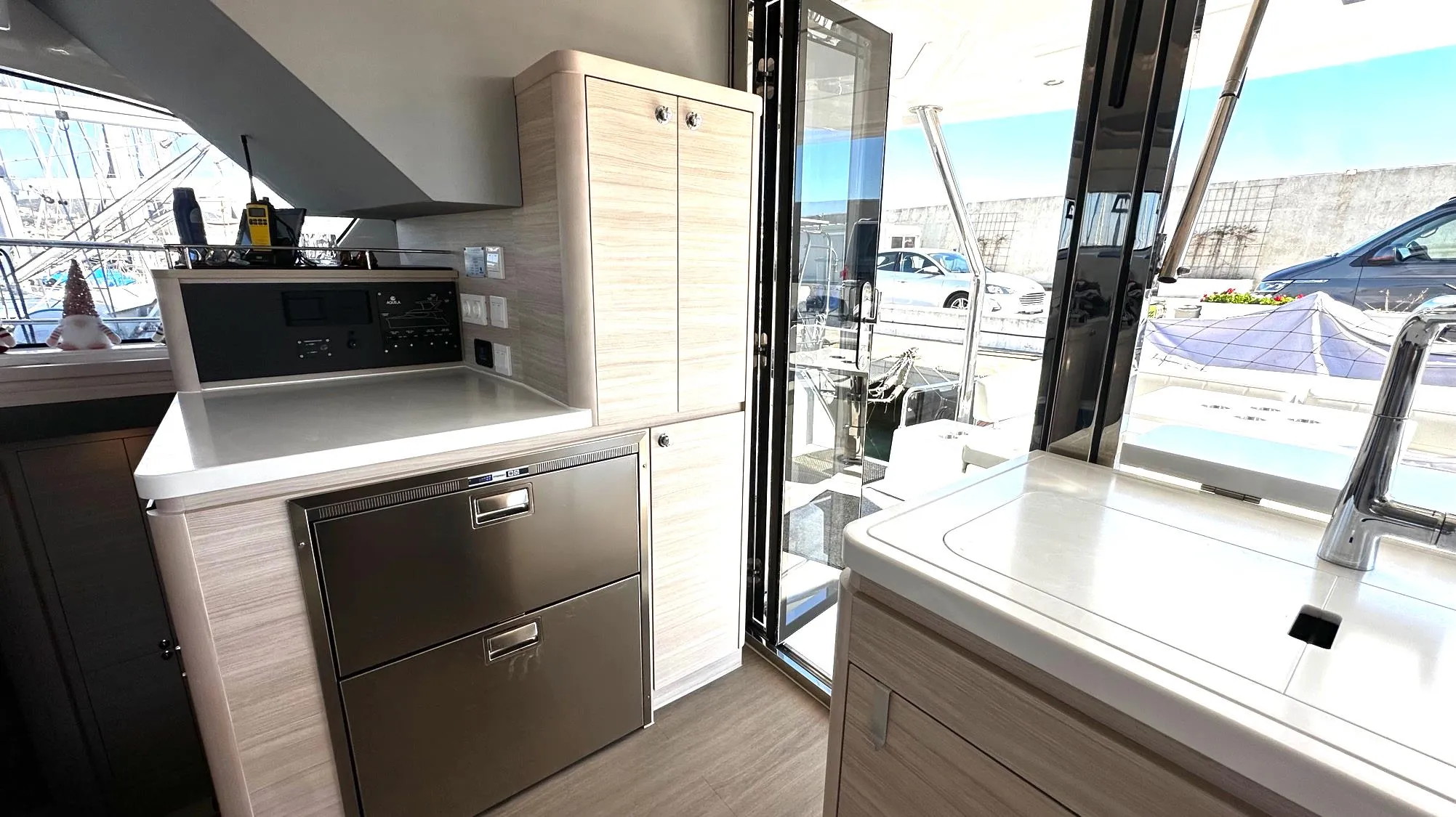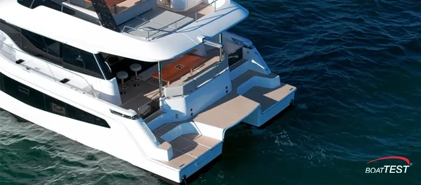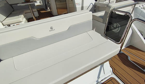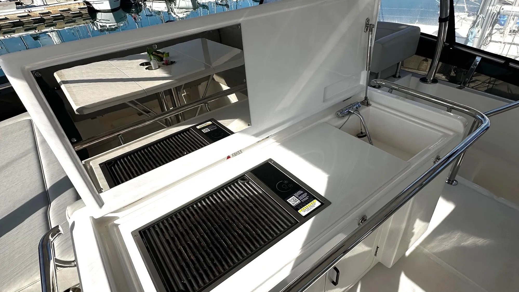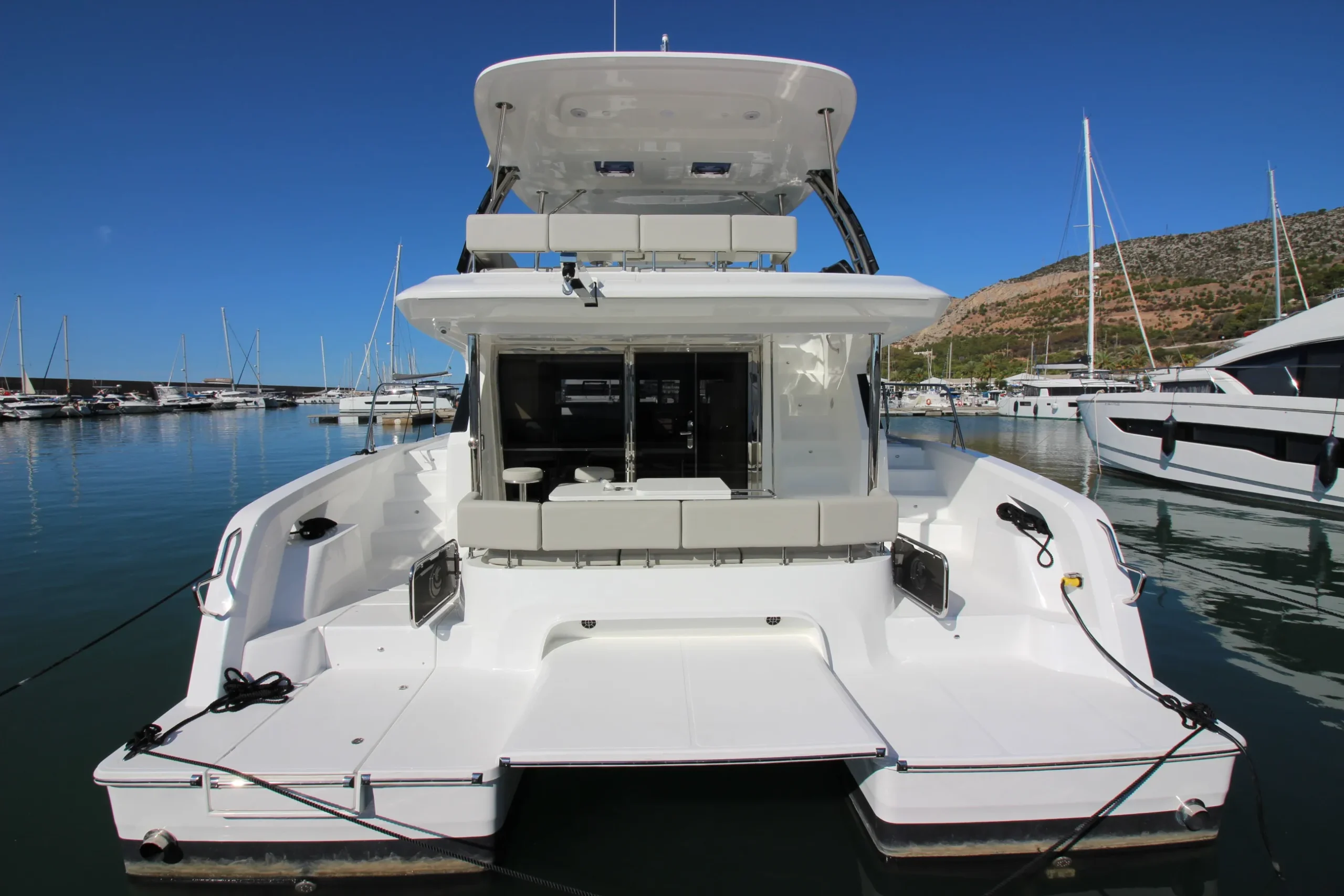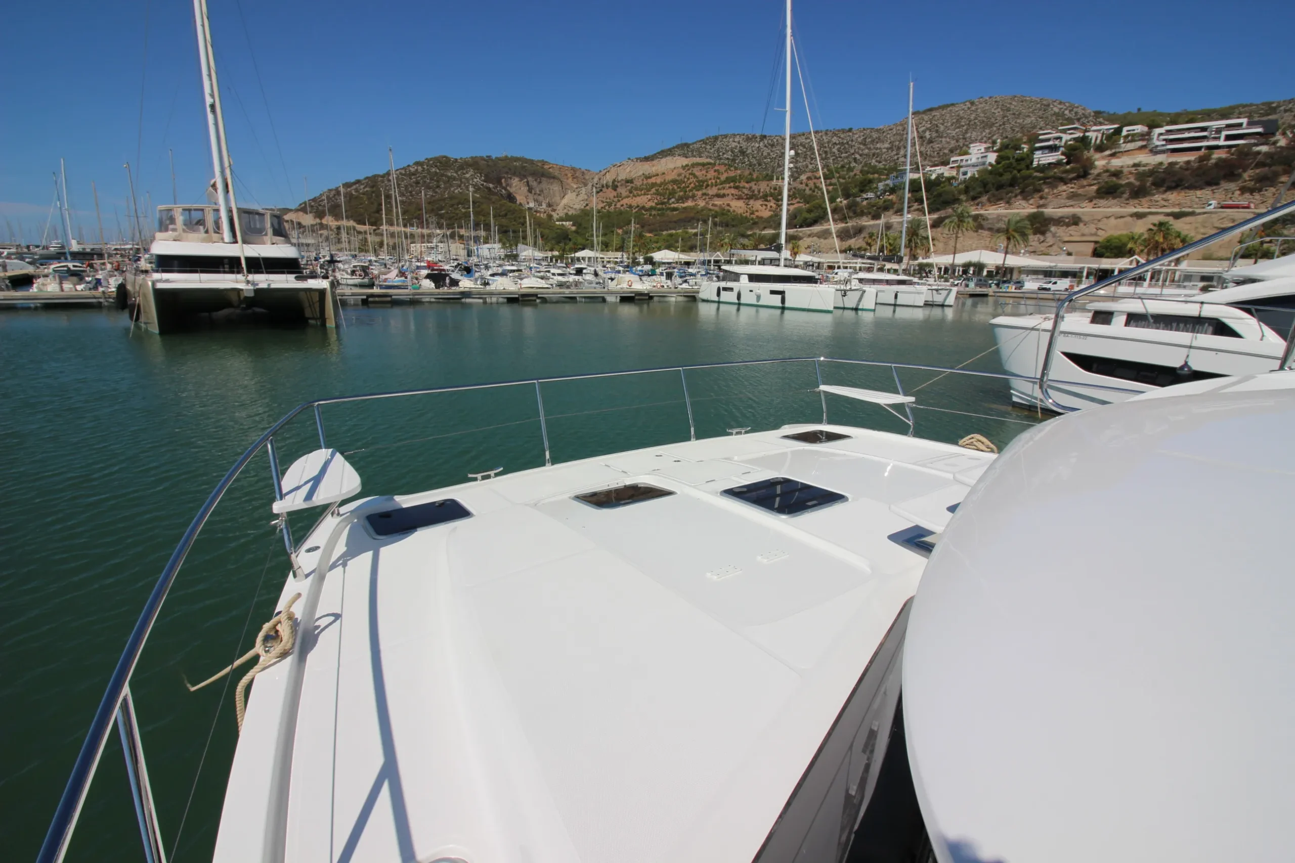 Aquila 46 de cinco cabinas, un baño, equipado con 2 motores intraborda Volvo Penta D6 de 480 HP, grúa eléctrica para dinghy con plataforma fija en popa, sistema de aire acondicionado de 50.000 BTU, completo pack de navegación Raymarine con piloto automático y radio VHF, además de foco con control remoto. Un catamarán robusto y listo para el charter, con flybridge, mesa y ducha en bañera, escalera de baño y cocina de inducción eléctrica. Entrega: Primavera 2026